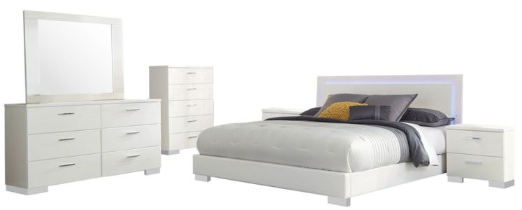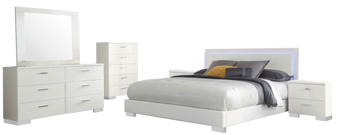 Modern design meets ambient lighting in this contemporary bedroom set. The bed features a white high gloss headboard with built-in blue LED lighting, activated by a convenient touch switch. A faux leather upholstered bed frame adds a refined touch, while matching storage elements offer smooth metal glides and chrome-finished details.Read More