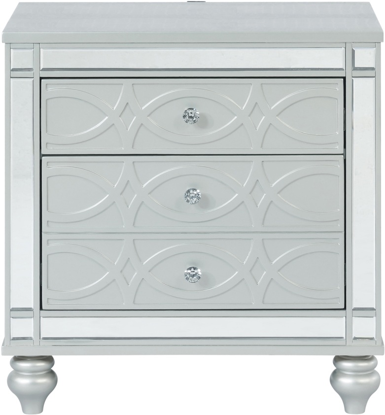 Bring modern glam to a classic design with this transitional two-drawer nightstand. It features a glitzy design that draws the eye in any modern home. It's crafted with a vibrant silver metallic finish with fret work detail on the front panels and drawer fronts. The drawers are adorned with crystal-like pulls and the top one is lined with black felt. Dual USB ports and delicate bun feet complete the design of this exquisite accent piece.