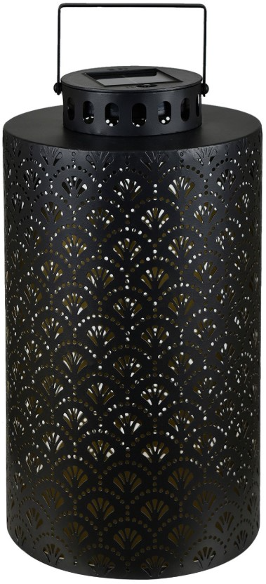 This solar-powered lantern features a black cylindrical metal frame with a fan-inspired cutout pattern that creates striking light effects when illuminated. The integrated solar panel charges during the day to provide soft ambient lighting at night. A metal handle makes it easy to carry or hang.Read More