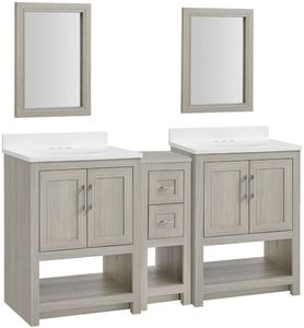 Complete Vanity Set: Includes two 18" framed mirrors, two durable white one-piece countertops with sinks, and pre-drilled holes for 4" centerset faucets (sold separately). Connect the 12" side cabinet to create a 61" wide vanity