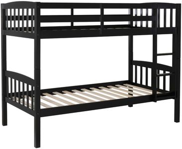 Transform your child's room with our stylish twin-sized bunk bed! Measuring 78.75" x 43.125" x 62.625", this space-saving marvel is crafted from durable rubberwood and finished in sleek black lacquer paint.Read More