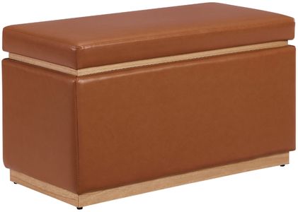 Out of sight storage, style, and comfort come together as one to form this versatile ottoman. The padded exterior is upholstered in caramel faux leather, offering a welcoming seat or footstool for two to kick up their feet without overcrowding.Read More