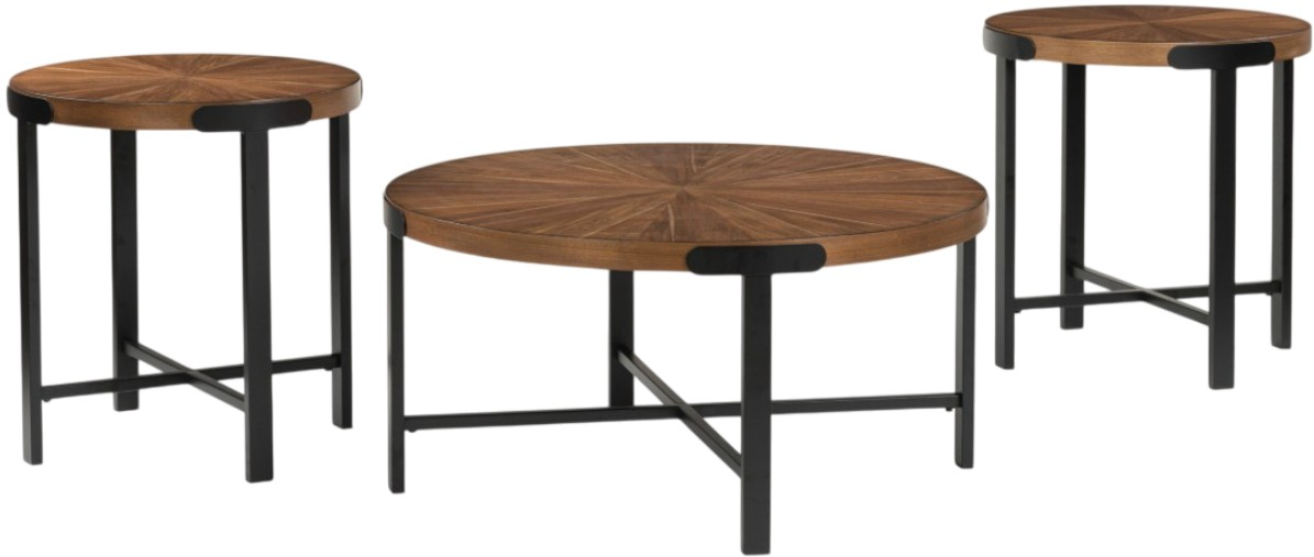 This occasional table set contrasts a rich brown wood tone with dark bronze-tone metal legs for a casual contemporary feel. An inlay sunburst pattern on the tabletops channels both modern aesthetics and the comforting vibe of natural materials. Complete with a coffee table and matching end tables.Read More